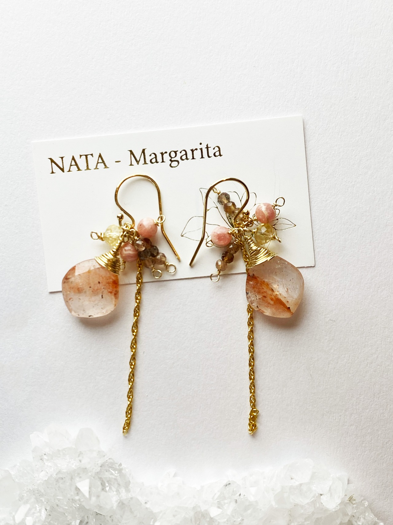 ヒマラヤンクォーツのインクルージョンやクラック、色味の入り方を生かしたピアスを制作しました。ねじれタイプの14kgfのチェーンがバランス感を引き立てています。